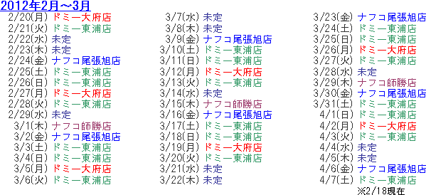 | 12/27(火) | ドミー東浦店 | 1/12(木) | 未定 | 1/28(土) | ドミー東浦店 |